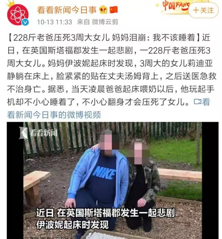 本文原始标题是:228斤老爸睡觉压死3周大的女儿?妈妈痛哭:我不该睡着…